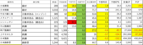 鉄鋼③です。日亜鋼業:PERがやや高く、ROEが低く、FCFがマイナス日本精線:可もなく不可もなくです中央可鍛工業:PERがやや高く、ROEが低いメタルアート:ROEが低いですシンニッタン:PERが異常に高く、ROEが低い中山製鋼所:ROEが低いです神戸製鋼所:自己資本率が低く、ROE、EPS...