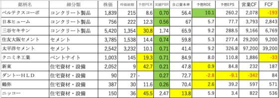 ガラス・土石製品②です。ベルテクスコーポ:ROEがやや高く、FCFがマイナス日本ヒューム:可もなく不可もなくです三谷セキサン:PERがやや高いです住友大阪セメント:可もなく不可もなくです太平洋セメント:可もなく不可もなくですクニミネ工業:PERがやや高く、FCFがマイナス新東:PERが高く、R...