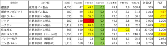 ゴム製品②です。櫻護謨:PERが高いです藤倉コンポジット:PERがやや高く、FCFがマイナス朝日ラバー:PERがやや高く、FCFがマイナスフコク:PERが異常に高いですニチリン:PERが高く、FCFがマイナス住友理工:PERが高く、ROEは低い西川ゴム工業:PERがやや高く、FCFがマイナスバ...