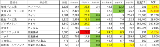 ゴム製品①です。相模ゴム工業:PERとROEがやや高く、FCFがマイナスTOYO TIRE:PERとROEがやや高く、FCFがマイナス横浜ゴム:PERがやや高いです住友ゴム工業:PERがやや高いですブリヂストン:PERがやや高いですオカモト:可もなく不可もなくです不二ラテックス:PERが異常に...