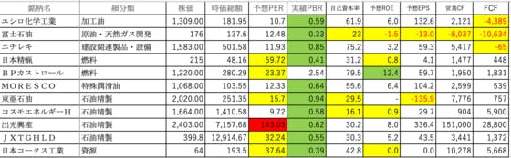 石油・石炭製品です。ユシロ化学工業:FCFがマイナスです富士石油:自己資本率が低く、ROE、EPS、営業CF、FCFがマイナスニチレキ:FCFがマイナスです日本精蝋:PERが高く、ROEが低いBPカストロール:PERとROEがやや高いMORESCO:可もなく不可もなくです東亜石油:PERがやや...