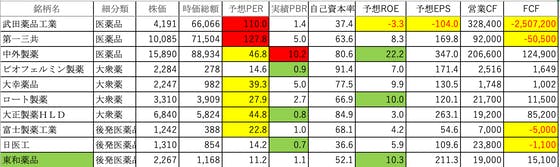 医薬品⑥です。武田薬品工業:PERが以上に高く、ROE、EPS、FCFがマイナス第一三共:PERが異常に高く、FCFがマイナス中外製薬:PERとPBR、ROEが高いビオフェルミン製薬:可もなく不可もなくです大幸薬品:PERが高いですロート製薬:PERが高く、ROEはやや高い大正製薬HLD:PE...