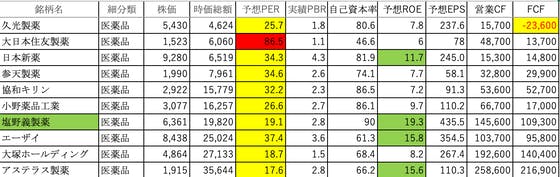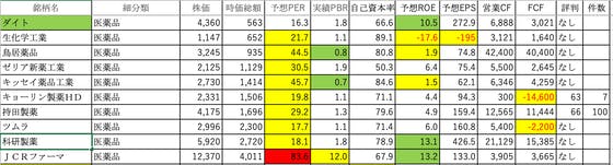 医薬品⑤です。久光製薬:PERがやや高く、FCFがマイナス大日本住友製薬:PERが異常に高いです日本新薬:PERが高く、ROEがやや高い参天製薬:PERが高いです協和キリン:PERが高いです小野薬品工業:PERがやや高いです塩野義製薬:PERとROEがやや高いエーザイ:PERが高く、ROEがや...