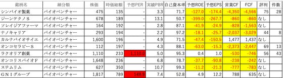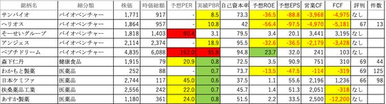 医薬品③です。サンバイオ:ROE、EPS、営業CFとFCFがマイナスヘリオス:ROE、EPS、営業CFとFCFがマイナスそーせいグループ:PERが高すぎますアンジェス:ROE、EPS、営業CFとFCFがマイナスペプチドリーム:PERが異常に高すぎ、ROEが高い森下仁丹:PERがやや高いですわか...