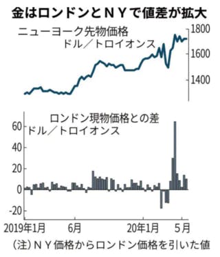 金、揺らぐ「一物一価」金の国際市場で「一物一価の法則」が揺らいでいる。世界の金取引の中心であるニューヨークの先物市場とロンドンの現物市場で4月中旬、通常1~2ドルの金1トロイオンスの価格差が約70ドルまで拡大した。新型コロナウイルスの感染拡大で都市間物流が止まったためだ。主要な需要国である中国...