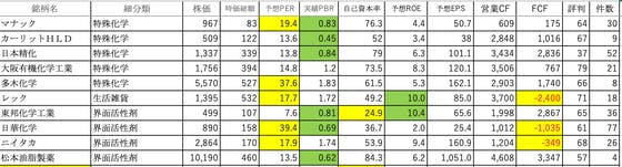 化学16です。マナック:PERがやや高いですカーリットHLD:可もなく不可もなくです日本精化:可もなく不可もなくです大阪有機化学工業:可もなく不可もなくです多木化学:PERがやや高いですレック:PERとROEがやや高く、FCFがマイナス東邦化学工業:自己資本率が低く、ROEがやや高い日華化学:...