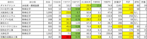 化学15です。ダイキアクシス:自己資本率が低く、ROEはやや高く、FCFはマイナス川口化学工業:自己資本率が低く、FCFはマイナス大阪油化工業:PERはやや高く、FCFはマイナス丸尾カルシウム:ROEが低いですケミプロ化成:PERがやや高く、自己資本率とROEが低い細谷火工:PERが高いですヤ...