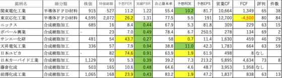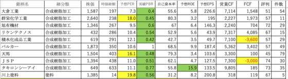 化学11です。関東電化工業:ROEがやや高いです東京応化工業:PERがやや高く、FCFがマイナスニックス:可もなく不可もなくですポバール興業:可もなく不可もなくですサンエー化研:PERが高く、ROEが低い天昇電気工業:ROEがやや高いです日本ユピカ:PERが高く、ROEが低い日本カーバイド工業...