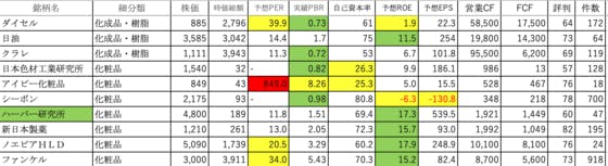 化学⑨です。ダイセル:PERが高く、ROEが低い日油:ROEがやや高いですクラレ:可もなく不可もなくです日本色材工業研究所:自己資本率が低いですアイビー化粧品:PERが異常に高く、PBRも高く、自己資本率が低いシーボン:ROEとEPSがマイナスハーバー研究所:ROEが高い新日本製薬:ROEが高...