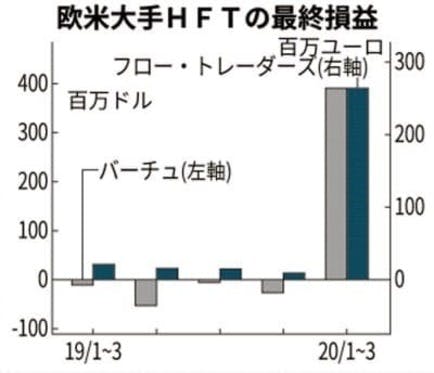 「欧米の高速取引業者、波乱相場で利益急増」米ダウ工業株30種平均が一日に3000ドルも上下した3月の波乱相場のなかで、コンピューターで大量の注文を高速で繰り返すHFT(ハイ・フリークエンシー・トレーディング)業者が大きな利益を上げた。上場する欧米大手2社の2020年1~3月期の純利益は300億...