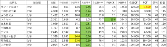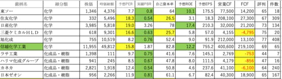 化学⑧です。東ソー:ROEがやや高いです住友化学:PERがやや高く、自己資本率は低い日産化学:PERとROEがやや高い三菱ケミカルHLD:PERがやや高く、自己資本率は低く、FCFはマイナス旭化成:可もなく不可もなくです信越化学工業:PERとROEがやや高いラサ工業:FCFがマイナスですハリマ...