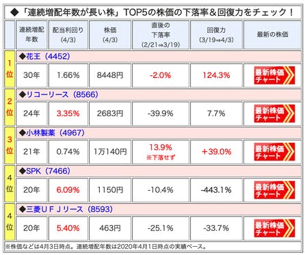 「連続増配株」の株価は“コロナ・ショック”でどう動いたのか?長期的に増配を続ける「連続増配株」は、個人投資家からの注目度が高く、株価が下がりにくい傾向がある。それでは、今回の「コロナ・ショック」で、「連続増配株」の株価はどのように動いたのだろうか? 連続増配年数トップ5の銘柄の「コロナ・ショッ...