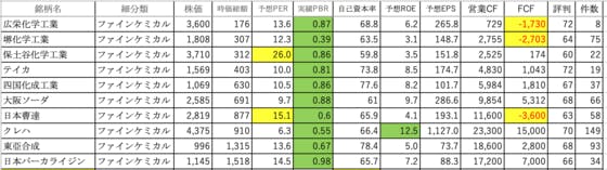 化学③です。広栄化学工業:FCFがマイナスです堺化学工業:FCFがマイナスです保土谷化学工業:PERがやや高いですテイカ:可もなく不可もなくです四国化成工業:可もなく不可もなくです大阪ソーダ:可もなく不可もなくです日本曹達:PERがやや高く、FCFがマイナスクレハ:ROEがやや高いです東亞合成...