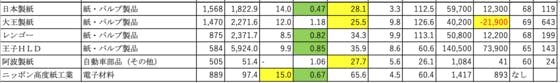 パルプ・紙③です。日本製紙:自己資本率が低いです大王製紙:自己資本率が低く、FCFがマイナスレンゴー:可もなく不可もなくです王子HLD:可もなく不可もなくです阿波製紙:自己資本率が低いですニッポン高度紙工業:PERがやや高いです最後までパッとしませんでした。1社くらい革新的な会社があっても良い...