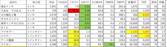 化学①です。東京インキ:可もなく不可もなくですT&K TOKA:PERが異常に高いです大日精化工業:FCFがマイナスですサカタインクス:可もなく不可もなくです東洋インキSCHD:可もなく不可もなくですDIC:可もなく不可もなくですフマキラー:PERが高く、営業CFとFCFがマイナスエステー:P...