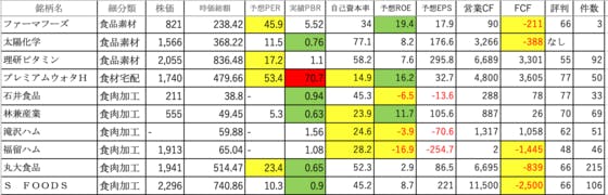 食料品11です。ファーマフーズ:PERとROEが高く、FCFがマイナス太陽化学:FCFがマイナスです理研ビタミン:PERがやや高いですプレミアムウォタH:PERとPBRが高すぎ、自己資本率が低すぎ石井食品:ROEがマイナスです林兼産業:自己資本率が低く、ROEはやや高い滝沢ハム:自己資本率が低...