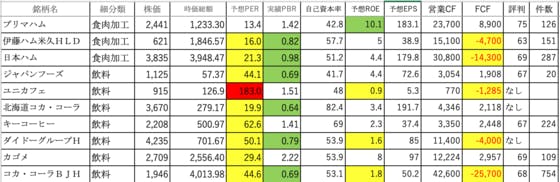 食料品12です。プリマハム:ROEがやや高いです伊藤ハム米久HLD:PERがやや高く、FCFがマイナス日本ハム:PERがやや高く、FCFがマイナスジャパンフーズ:PERが高いですユニカフェ:PERが異常に高く、ROEが低く、FCFはマイナス北海道コカ・コーラ:PERがやや高いですキーコーヒー:...