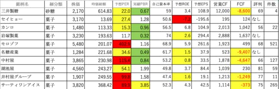 食料品⑤です。三井製糖:PERがやや高く、FCFがマイナスセイヒョー:PERが高く、ROEがマイナスカンロ:可もなく不可もなくです岩塚製菓:ROEが低いですモロゾフ:PERが異常に高いです名糖産業:PERが高く、ROEが低く、FCFがマイナス中村屋:PERが非常に高く、ROEが低く、FCFがマ...