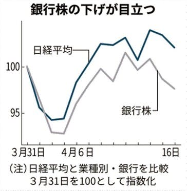 「銀行株下落に映る景気不安、政策効果への期待後退」政策期待などを背景に好転しつつあった市場心理に再び冷や水が浴びせられた。個人消費の停滞など米経済統計を中心に、新型コロナウイルスによる影響が改めて意識された。16日の日経平均株価の下げ幅は一時400円に迫った。市場が注目するのは銀行株の軟調な動...