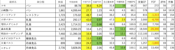 食料品②です。コモ:PERとPBR、ROEも高いです山崎製パン:PERが高いですイートアンド:PERが高く、FCFがマイナス六甲バター:PERが高く、ROEが低く、FCFがマイナス雪印メグミルク:可もなく不可もなくです森永乳業:ROEがやや高いが、FCFがマイナス明治ホールディング:PERとR...