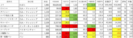 食料品①です。JT:ROEがやや高いですピエトロ:PERが高すぎ、ROEが低いですダイショー:PERが高いですエバラ食品工業:PERがやや高いですケンコーマヨネーズ:FCFがマイナスですキユーピー:PERが高いです北の達人コーポ:PERとPBRが高すぎ、ROEも高いユーグレナ:ROEとFCFが...