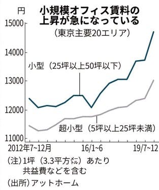 「小型オフィス、賃料急上昇」東京都内で広さが50坪(165平方メートル)以下の小規模オフィスビルの賃料の上昇が急だ。不動産情報サービスのアットホーム(東京・大田)によると、2019年7~12月の都内主要地域の平均募集賃料は12年下期の調査開始以来、最高となった。空室消化が進み賃料を押し上げてい...