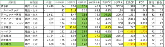 建設業⑧です。植木組:可もなく不可もなくですナカボーテック:PERがやや高いです第一カッター興業:ROEがやや良いですナカノフドー建設:可もなく不可もなくです巴コーポレーション:可もなく不可もなくです金下建設:PERが異常に高く、ROEが低く、FCFはマイナスヤマウラ:営業CFとFCFがマイナ...