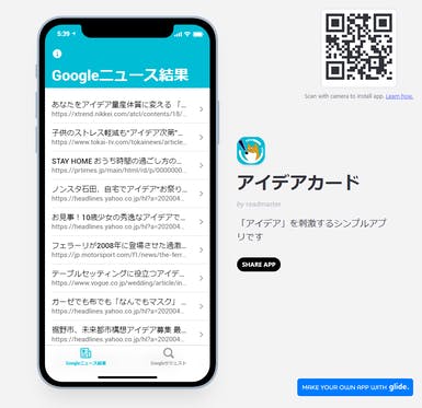 先回はアイデアカフェでしたが、もっとシンプルなアイデア発想カードを作りました。本当は入力してインタラクティブなものにしたかったんですが、さすがにそれは厳しかったです。そこでシンプルにGoogleさんからデータを得てそれを表示。他でも代替できるのですが、習作っぽくアプリで出来ることで、glide...