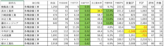 建設業④です。暁飯島工業:可もなく不可もなくです高田工業所:ROEは悪くないですが、自己資本率が低いです川崎設備工業:ROEが悪くないです田辺工業:ROEが悪くないです藤田エンジニア:ROEが悪くないです協和日成:ROEが低めで、FCFがマイナス中外炉工業:営業CFとFCFがマイナス大成温調:...