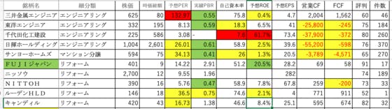 建設業は171社。10社ずつ順番に見ていきましょう。三井金属エンジニア:PERが132倍と高すぎます。ROEは0.4%と低すぎます東洋エンジニア:自己資本率が18%と低く、営業CFもFCFもマイナスです千代田化工建設:自己資本率7.6%はまずいのではないでしょうか? ROEも異常値に日揮ホール...