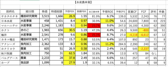 水産農林業は、11社。・サカタのタネ:PER26.9倍はちょっと高いですね。可もなく不可もなく。・日本水産:ROE11%は悪くないです。PBRも1倍割っています。・マルハニチロ:自己資本率23.7%はちょっと低いですね・ホクト:PER30.5倍は高いですね。FCFもマイナスです・極洋:自己資本...