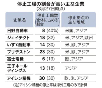 「米欧工場、日本企業の半数が停止 中国は8割が平常に」新型コロナウイルスの感染拡大で、日本のメーカーの生産への影響が広がっている。日本経済新聞が主要な製造業各社に取材したところ、回答企業の半数が米国と欧州の工場で生産を停止していることが分かった。打撃が大きいのは需要減に直面する自動車だ。一方、...