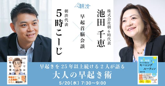 「早起きをきっかけに、自分らしい生き方に目覚める人を増やしたい」この想いのもと、朝活コミュニティ『朝渋』は、早起きの価値を感じていただく様々な活動をしています。特に、平日朝7:30から始まる『朝渋イベント』は、これまで140回以上開催され、豪華なゲストの多様な価値観に触れられる朝の人気イベント...