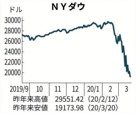 「3年間のトランプ相場 帳消し」米連邦準備理事会(FRB)の電撃的な金融緩和で幕を開けた今週のダウ工業株30種平均は週間では4011ドル(17%)下落した。下落率は金融危機の2008年10月以来、11年半ぶりの大きさだ。20日のダウ平均は913ドル安の1万9173ドルと反落。トランプ米大統領が...