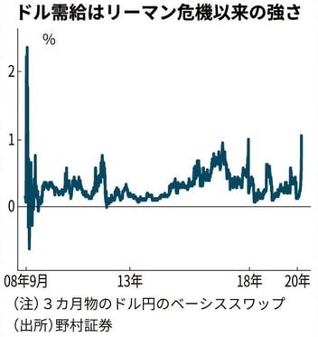 「ドル調達コストが上昇」邦銀のドルの調達コストが上昇している。市場でドルを調達するために支払う上乗せ金利はリーマン危機以来の高水準となった。新型コロナウイルスの世界的な感染拡大にともない、手元にドル資金を置いておきたい金融機関や企業のドル需要が強まっているためだ。市場では当面はドル需要が高止ま...