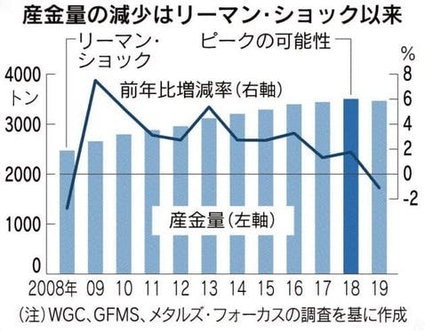 「金、生産ピーク説に現実味」金市場で産金量がピークに達したとする「ピークゴールド」説が話題を呼んでいる。2019年は通年で金価格が2割上昇。本来は産金量が増える要因になり得るが、19年は11年ぶりに減少に転じた。生産コストの増加や鉱床の減少、投資の減速が響いた。短期的な相場を動かす材料にはなら...