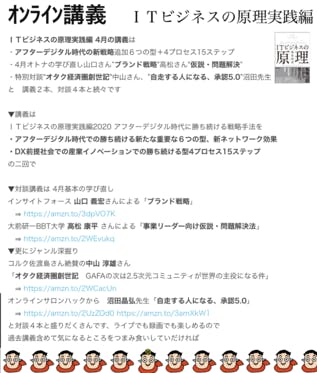 ITビジネスの原理実践編 4月の講義は・アフターデジタル時代の新戦略追加6つの型+4プロセス15ステップ・4月オトナの学び直し山口さん”ブランド戦略"高松さん"仮説・問題解決”・特別対談"オタク経済圏創世記"中山さん、”自走する人になる、承認5.0”沼田先生と 講義2本、対談4本と続々です▼講...