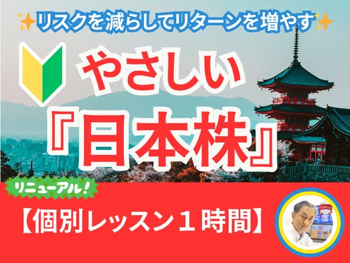 この商品は、1時間の個別オンラインレッスンです。『日本株投資』でリスクを限界まで減らし、大きなリターンをめざす!1.こんなお悩み、ありませんか?「NISAの成長投資枠、どう使えばいい?」 「株式投資は難しそう」「日本株の銘柄選定がよくわからない」「売買タイミングどうしたらいいの?」そんなお悩み...