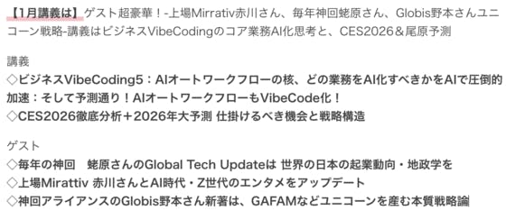 【1月講義は】ゲスト超豪華!-上場Mirrativ赤川さん、毎年神回蛯原さん、Globis野本さんユニコーン戦略-講義はビジネスVibeCodingのコア業務AI化思考と、CES2026&尾原予測
