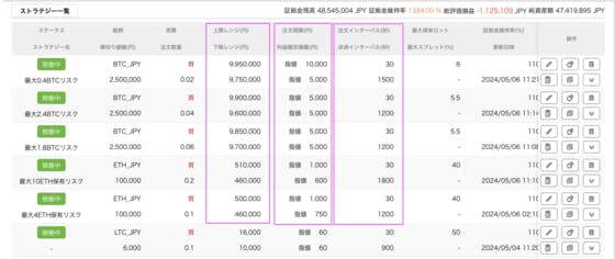 BTCが上昇してきました。昨日、レンジ設定変更と利益確定注文の間隔を狭くしました。注文インターバルはほとんど変わらず、1200-1800秒にしております。現状、960-995万円のレンジで全て買い下がってレバレッジ1倍程度のレベルに抑えながら回転売買を狙っていきます。今の所、Cトレの利益確定の...