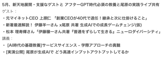 5月、新天地展開・支援なゲストと アフターGPT時代必須の教養と尾原の実践ライブ共有ゲスト:・元マイネットCEO 上原仁 「創業CEOが40代で退任!継承と次に仕掛けること」・新著最速解説! 伊藤羊一さん x尾原 共著 生成AIでの成長ゲームチェンジ(仮)・松本 理寿輝さん「伊藤穣一さん共著『...