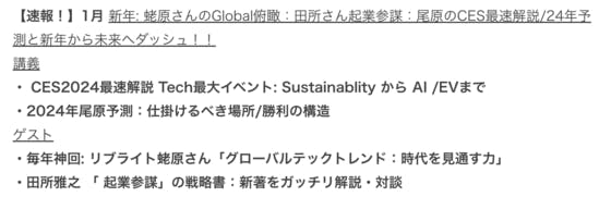 【速報:1月は】新年: 蛯原さんのGlobal俯瞰:田所さん起業参謀:尾原のCES最速解説/24年予測- ITビジネスの原理実践編
