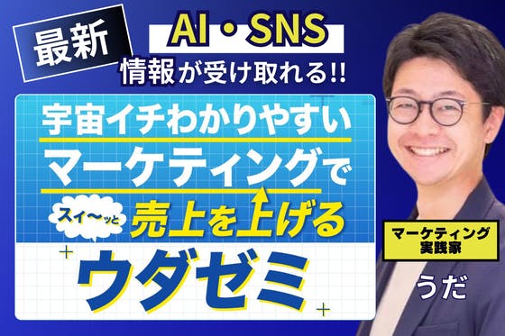 ウダゼミは、宇宙イチわかりやすくマーケティング理解しながら自分のビジネスの売上を上げ、結果自由度の高い人生を送るためのゼミです。以下のコンテンツを提供しています。====================①ノウハウ動画提供(進化型講座形式)常時30本以上③最新トレンドセミナー 月1回(第1金曜日...