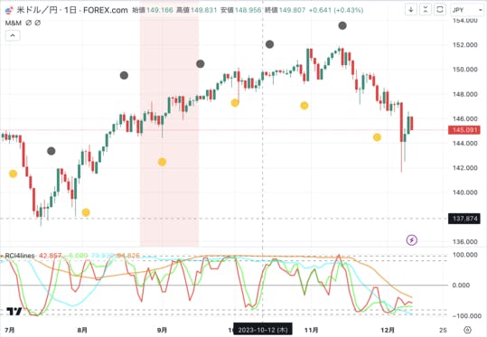 さすがにポジションをパンパンにしすぎたため、ドル円ポジションを縮小して、レバレッジを調整します。ここ最近負けが込んでいるので、気休めですが、含み益のあるポジションを中心に手仕舞います。以下、ドル円145.10円、ユーロ円156.70円でポジション縮小します。【既存ポジション】レバレッジ9倍程度...