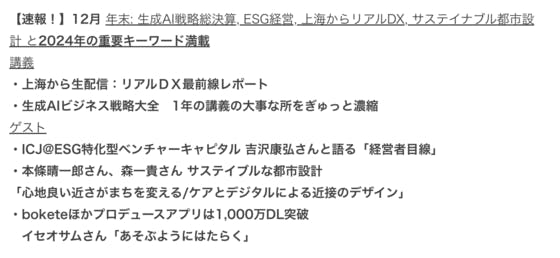 【速報!】12月年末: 生成AI戦略総決算, ESG経営, 上海からリアルDX, サステイナブル都市設計 と2024年の重要キーワード満載