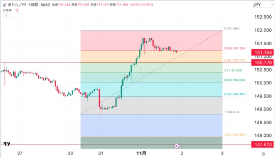 今夜の戦略です。FOMCでどさくさに紛れて152円近辺まで追い込む事を予想しております。しかしながら、介入警戒感から一度反落は十分あり得るでしょう。よって、目先高値を152円手前にあらかじめおいて、フィボナッチを引きました。そうしますと、クラスターポイントが150.78に引けます。まずはこの水...