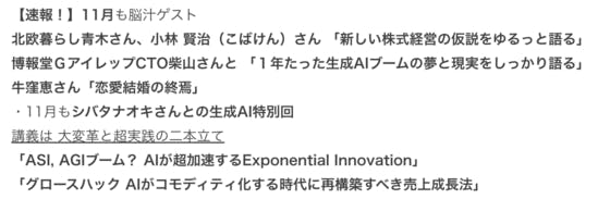 【速報!】11月も脳汁ゲスト北欧暮らし青木さん、小林 賢治(こばけん)さん 「新しい株式経営の仮説をゆるっと語る」博報堂GアイレップCTO柴山さんと 「1年たった生成AIブームの夢と現実をしっかり語る」牛窪恵さん「恋愛結婚の終焉」・11月もシバタナオキさんとの生成AI特別回講義は 大変革と超実...