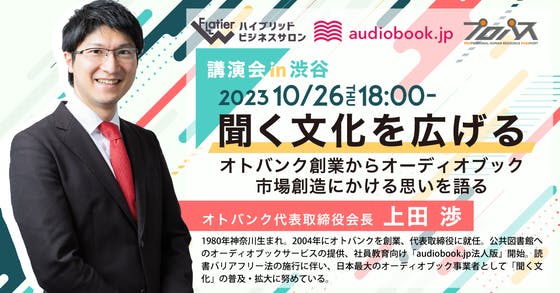 ハイブリッドビジネスサロンFlatier主催 株式会社オトバンク代表取締役会長 上田渉氏 特別講演会を開催音声メディアが今熱い!日本最大級のオーディオブック配信サービス「audiobook.jp」を運営。2022年6月時点で会員数250万人を突破。今回Flatierでは、創業会長の上田渉氏にオ...