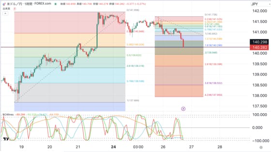 成行配信で申し訳ないのですが、ドル円がちょうどよい水準にきました。クラスターポイントです。フィボナッチとエクステンションと条件が2つ以上重なるラインです。ドル円を成行でロングします。【新規成行注文】ドル円140.29 レバ0.50倍 ストップ140.14 リミット140.79極めて短期なデイト...