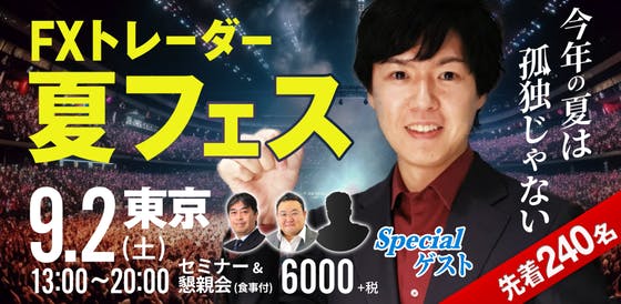 トレードは孤独で一人で相場に向き合うことが多いものです。しかし、一緒に相場の方向性やシナリオについて議論できる仲間がいれば、もっとトレードが楽しく前向きになれるかもしれません! そういった考えから、「FXセミナー」+「交流会」がセットになったイベント 【FXトレーダー夏フェス2023】を開催す...